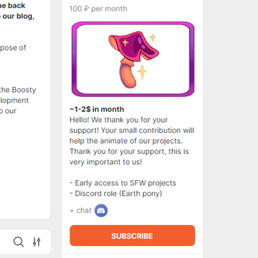 - If you have a ready-made OC's character for (sfm\blender) you get 5%- Boosty tiers: 5$ - 5% \ 15$ - 10%